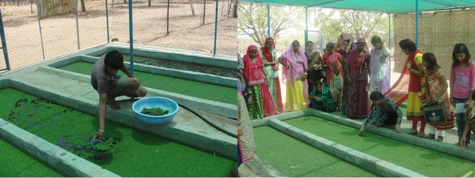 Azolla is a freshwater floating fern, grown naturally in stagnant water. In arid region of Rajasthan, availability of green fodder for livestock is not certain. Its availability totally depends upon monsoon. Azolla is the best substitute of green fodder in arid region of Rajasthan. Farmers can produce Azolla with minimum water and at low production cost throughout the year for their animals. It is very rich in proteins, vitamins (A, B12, Beeta carotene), growth promoter and minerals (Calcium, Phosphorus, Copper, Ferrous, Potassium and Magnesium). Its nutrient composition makes it a highly efficient and effective feed for Livestock. Fresh Azolla should be washed before feeding to get rid of the dung smell. It can be feed directly to livestock or added to the regular feed. It can be mixed with home- made concentrate in the ratio of 1:1. Thirty percent cake can be replaced in the ration of livestock.